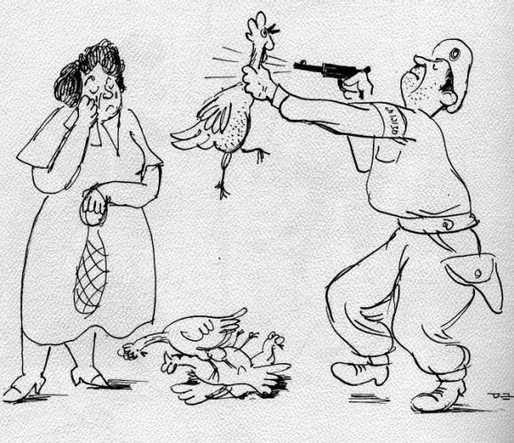 פקח יורה בתרנגולת מן השוק השחור קריקטורה של יוסף בס 17.3.50 תמונה הבאה פקח יורה בתרנגולת מן השוק השחור קריקטורה של יוסף בס 17.3.50