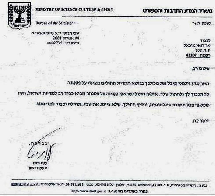 החתול המנגן יוסיף כבוד למדינת ישראל. מכתב עוזרת השר וילנאי